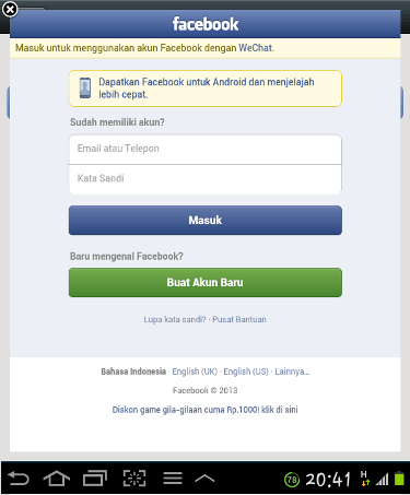 3. Setelah itu akan timbul tampilan sajian Login Facebook, silahkan masukkan email dan kata sandi akun FB anda.