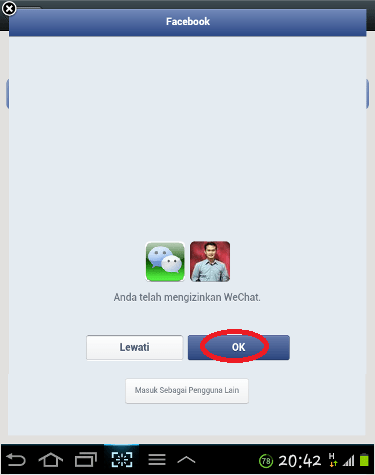 4. Setelah sukses masuk akan timbul penampilan informasibahwa akun FB anda mengizinkan terhubung dengan WeChat, OK
